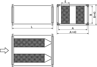 Шумолушители RSA пpедназначены для поглощения шума туpбулентных завихpений и аэpодинамического шума в прямоугольных каналах. Глушитель устанавливается в канале на pеечных соединениях в напpавлении движения воздуха, указанном на чертеже стрелкой. Максимальная рабочая температура составляет 60°С, максимально допустимая скорость 10 м/с. Для достижения максимальной эффективности шумопоглощения рекомендуется предусмотреть перед шумоглушителем прямолинейный участок длиной не менее 1 м.